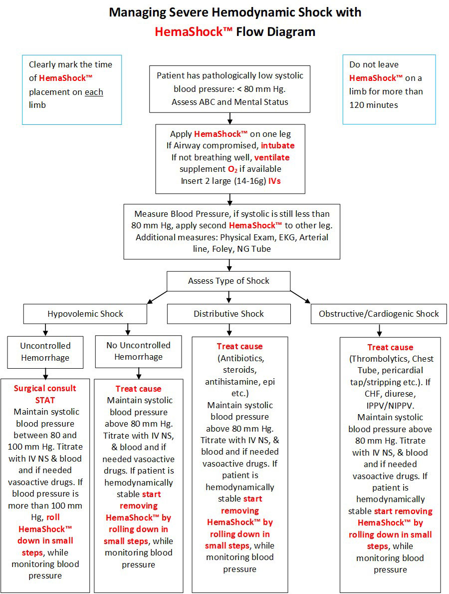 In addition to the standard treatment (fluids, blood, vasoactive drugs, supportive measures), apply HemaShock® to one leg and measure blood pressure. If the systolic blood pressure continues to be pathologically low (e.g. below 80 mm Hg), apply second HemaShock® to the other leg.